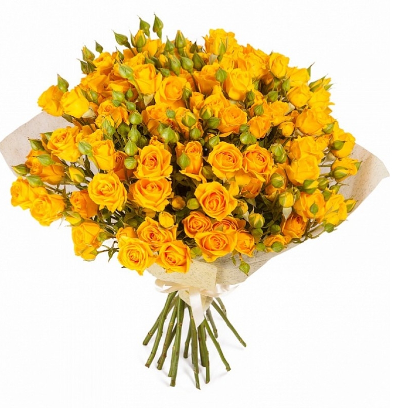 Букет состоит из 17 желтых кустовых роз, красивая упаковка, атласная лента.